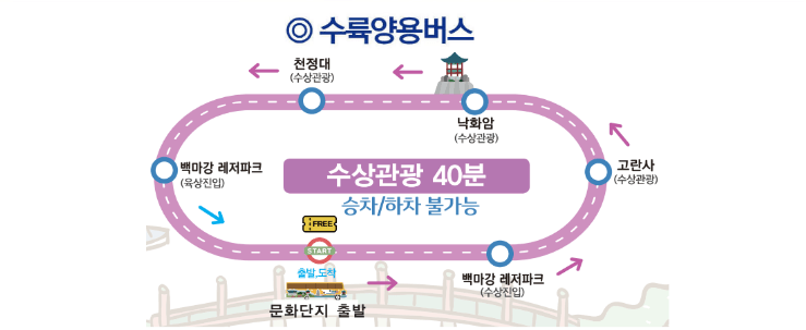 ➡️ 수륙양용버스 출발 : 백제문화단지 출발 ➡️ 백마강 레저파크 (수상진입) ➡️ 고란사 ➡️ 낙화암 ➡️ 천정대 ➡️ 백마강 레저파크 ( 육상 진입) ➡️ 수륙양용버스 하차 후 순환버스 환승