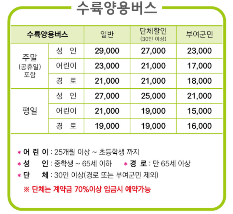 부여 수륙양용 시티투어 버스 이용요금은 아래와 같으며, 할인정보를 확인하셔서 적용을 받으시는 것을 추천드립니다.