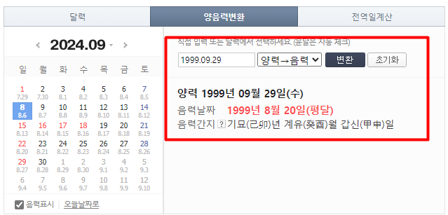 양력 날짜를 입력하게 되면 바로 음력 날짜를 확인하실 수 있습니다.